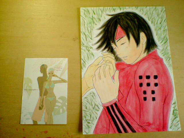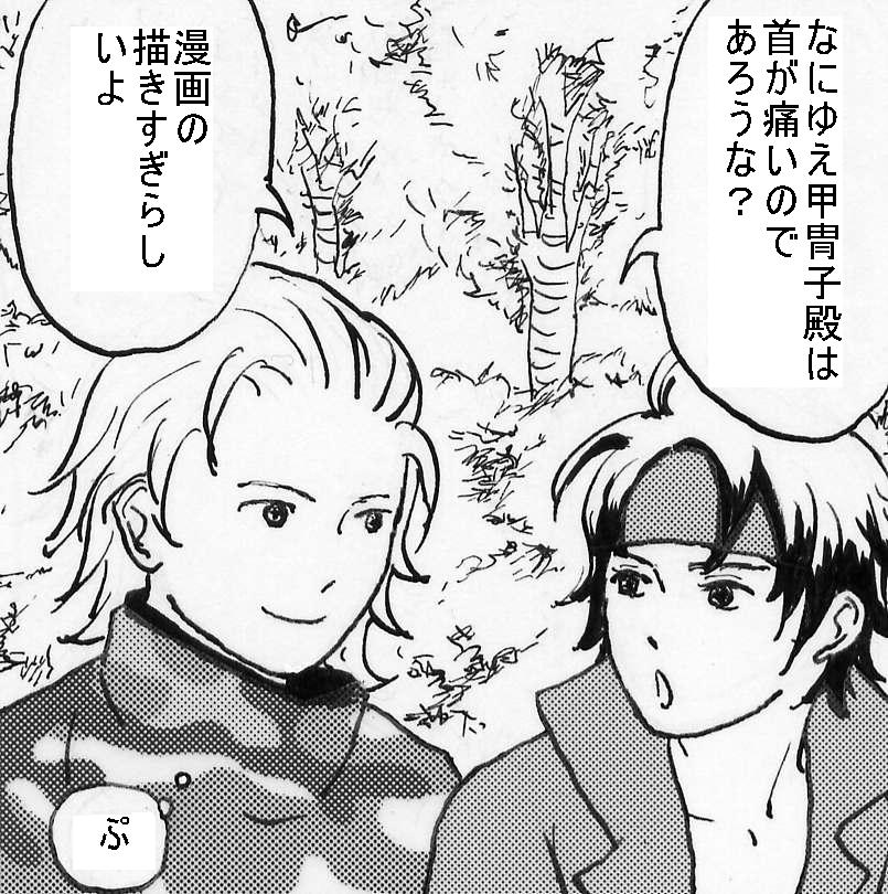 × [PR]上記の広告は3ヶ月以上新規記事投稿のないブログに表示されています。新しい記事を書く事で広告が消えます。 こんにちは。甲冑子です。 右の絵をごらんください。表紙案1に色を塗りました。 すいません。色塗りが苦手なんです。下手っぴぃだけど許して。 そしてついでに左の絵をごらんください。 同じ絵の学校に通っているSちゃんから来たポストカードです。 どうして同じところで絵を習っててこんなにもオシャレ度に差があるのだろうか。 どうして同じ手つなぎ絵なのにこんなに差が。 まあ腐ってるか腐ってないかの差なんですけどね。 しかし、やっぱプロでイラストレーターやってる子はうまいね~。オシャレだよね。 オシャレなBASARA同人誌の表紙って描けないもんだろうか。 腐とオシャレは両立できるのだろうか。 その前に私がオシャレにならないといけないんだけどね~。 あとさ、表紙を開いたときの絵も描いてイイ? この表紙に少なからずオチをつけようと思って。 さらに桔梗殿、挿絵は全部横書きでイイの? この土日でやっちゃわないと間に合わないからさ。 さあ、あともう一息。 こんばんは。甲冑子です。 表紙案その1。 「草むらで昼寝するユッキー」ということで、空いてるスペースは草だと思ってください。 んで、ユッキーの手をどうするか考えたんですけど、 ひとつの手だとどこにどう置いてもサマにならなくてね。 しょうがないから隣から誰かの手を伸ばしてきてユッキーの手を置いたら 動きが出てマシになりました。単品だけって難しいよね。 まあただこの絵だと、内容とのギャップがねえ。 ※中身はギャグ漫画です ってポップに書いとけば平気……なのか? あとユッキーばっか描いてるのオレだけだしなぁ。 みんなどうにも伊達が多い気がする。実はおにぎり衆から人気の伊達軍。 なんか表紙の案があったら教えてください。 やっと…!! 終わったよ!! 原稿!!! こんばんは。甲冑子です。嬉しいです。感無量です。 一時は終わらないかと思いました。時間があまりにもかかるので。 考えてみたら、1枚につき8時間かかってました。 下書き5時間、ペン入れとかトーン貼り3時間。 ネタを考えたりセリフやコマ割りの時間は入ってないので、 それも含めたら1枚につき10時間くらいはかかったんじゃなかろうか。 どんだけ~。 はぁぁ。とりあえずよかった。ホッとした。 まあ表紙と桔梗殿の挿絵が残ってますけどね。 でも漫画が終わっただけですっげーすっきりしたよ。ああ疲れた。 内容はさておきね。ちょっとオチがゆるいんだよね~。難しいよね~。 話は変わりますが、今日は『遥かなる時空の中で3 十六夜記』をやったのよ。 そこでさ、保志のキャラがさ、「うぅ…」とか「はぁ…」とか、よくうめくのよ。 そのうめき声がユッキーっぽくてさ~。スゲー萌えた。 こんばんは。甲冑子です。 3日前くらいから首が痛くてさ。特に左側。 ついに左腕までちょびっとしびれてきてさ。 なので整形外科に行ってきたよ。 そしたら「骨に異常はありませんが、筋肉が腫れてます」だって。 「同じ姿勢をずっとしてたでしょ?」と言われました。 ええしてましたよ。机に向かって漫画描いてましたよ。 それも今までにないような集中力でね!!! どうやら私は首の骨がまっすぐすぎるので、筋肉に負担がかかりやすいそうです。 その上、長い時間休みもせずに同じ姿勢をしていたもんだから 首から肩にかけての筋肉が腫れて神経を押して、腕にしびれが来たようです。 何回かリハビリに通わなくてはならないってさ。 まさにOTK病……。 皆さんもお気をつけください。 でも6Pまで仕上がりましたよ。残り8P!!!! |