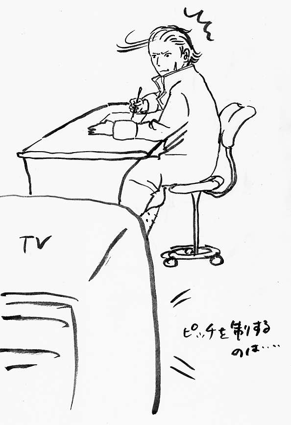 × [PR]上記の広告は3ヶ月以上新規記事投稿のないブログに表示されています。新しい記事を書く事で広告が消えます。 あなたも入りませんか? こんばんは。天パの甲冑子です。 昨日からペン入れしてるのですが、思ってたよりはかどってます。 まだトーンを貼りをしてないのでこの先はわからんけど、 下書きに時間をかけた分、本番が楽になっています。 そして一番の問題である髪の毛。 ユッキーは意外と白っぽくなっちゃって「なんだかな~」って感じですが、 慶次と毛利は上図のように筆ペンでキューティクル系にしようと思いました。 なんとなくイメージで髪の毛さらさらっぽそうだからね。 解像度が悪い上に腕が未熟なので上図ではさらさらに見えませんが。 そういや、あんぶーさんに毛利のストーリーを見せたら、 エンディングの毛利を見て「受受しいね~」とつぶやいていました。 あとあんまりアニキに反応してなかったよ。 私がアニキの声について「ウー様ウー様ウー様」言ってたからかな。 あんぶーさんもあんまウー様好きじゃないみたいだからね~。 そしてユッキーにはもっと興味ないみたい。 BASARA布教をかなりしてますが、ユッキーに反応したのはゆかり殿のみです。 意外よね~~。 PR こんにちは。甲冑子です。 ユッキーの髪の毛の色が黒では重過ぎるので、 どうしようかと思案した結果、このような塗り配分ならば 手間もあまりかからない上に重過ぎないだろうと思い至りました。 イメージとしてはこんなですが、本番のペン入れをして うまくいくかどうかは定かではない。 大変なんだな~漫画描くのって……。 さて話題は変わりますが、今年のおにぎり屋的流行語大賞は 姉の「まだ読んでない」に決まりかと思いきや、 この間の『乙女ロード急襲任務』時に、腐女子の神ことあんぶーさんが 発した言葉も大賞候補に挙げたいと思います。 私「あんぶーさんはやっぱ小政なんでしょ?」 あんぶーさん「うんそう。そうなんだけどさ、この先 リバりそうな気がする」 この不思議な日本語のインパクト。結構な破壊力です。 そして私も小政のリバを想像してみたところ、 「ああ、意外とイイかもね」という結論に達しました。 TVから政宗様の声が聞こえたときの正しい反応。 こんにちは。甲冑子です。 政宗様の声の人って、スポーツ関係のナレーションが多いよね。 ゆかり殿のコメントの「紙は無地ですか?」がとても気になりますが、 今日も今日とてOTK活動をしています。 でさ、自分で描いといてアレなんですが、 佐助とユッキーがいちゃついてると異様に腹が立ちますよね。 ホント、自分で描いてるくせに「え~、なんなのォ?」って言いたくなる。 まあ別にオチの前のフリなんですけどね…。 でも佐助な分、なんかまだマシかな。 これが政宗様だと思うと……絶対描けなそう。 しかし相変わらずにユッキーの顔が描けなくて困ってます。 昨日はひとコマに1時間かかりました。 定まらねえ…。 「あれ、この漫画原稿用紙、なんか薄いんですけど……」 こんにちは。甲冑子です。 私のニート生活にピリオドが打たれようとしています。 来週から働きに出ることになりました。 ということで、一日中自由に過ごせる期間はあと一週間! 存分にOTK活動に時間を費やしたいと思っております。 週の半ばには神が降臨なされることですし、 今週はものすごくOTK濃度の高い一週間となることでしょう。 さて、そんなわけで真昼間っから残りの漫画を描こうと思ったのですが、 ゆかり殿からもらった用紙が底をついたので、 この間自分で買ってきた用紙を見て驚いたよ。 なんか薄いんですけど。 手汗でもかこうもんならふにゃふにゃになりそうなんですけど。 よく表示を見たら「110kg」と書いてある。 今まで使っていた用紙は「135kg」。 なんで重さで表示してあるんだ。わかりにくいだろうが。 「薄い」とか「厚い」みたいな書き方を希望する…!! 紙がペラペラしてるのでちょっと心配になるのであった。 「よし、今から続きを描こう」と思ったが、今日は『もて王』最新刊とジャンプの発売日なので それを買いに行って読み終わってから続きに入りたいと思います。