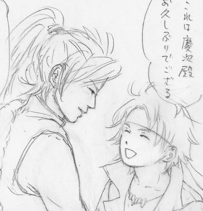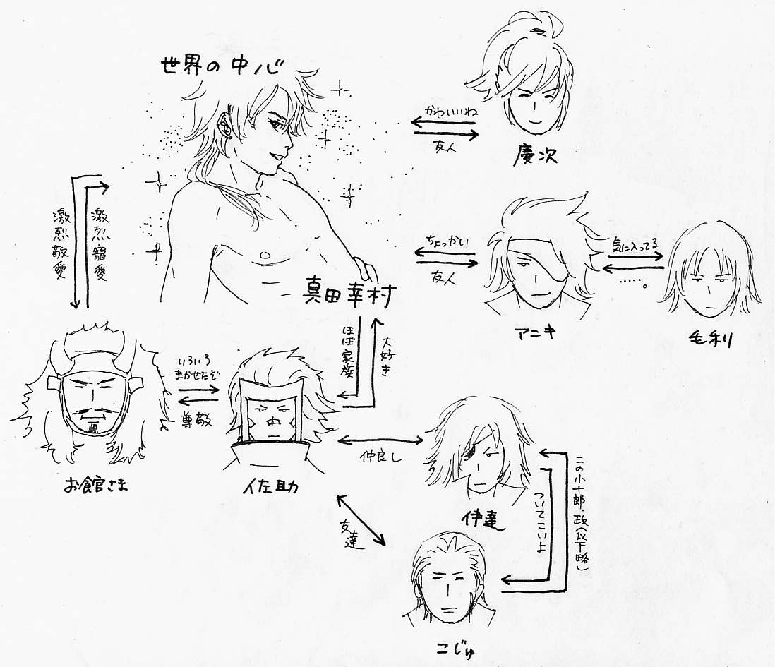 × [PR]上記の広告は3ヶ月以上新規記事投稿のないブログに表示されています。新しい記事を書く事で広告が消えます。 こんばんは。甲冑子です。 まだ下書きしてます。いつになったら終わるのかな。参ったね。 んで、本書きする前に、一回ユッキーの髪の毛を黒く塗った絵を描いておこうと思ってね。 なんつーか、やっぱ重っくるしくなるね。真っ黒だと。 うーん、よく一緒のコマにいる佐助を白くするから黒い方がイイかと思ったのだが…。 重そうだな~。髪の毛をちょっと短くしちゃおうかな~。 ついでに、絵の隣に自分に発破かけるようなセリフを入れました。 オラがんばるお。下書き進めるお。 その下書きなのですが、空いてるところに背景を入れようと手を加えるのですが、 どうもいつも林の中になっちゃうんだよね…。いつでも茂みに囲まれてるのさ。 茂みか家の中のどっちか。バリエーション(というか想像力)の限界。 あとゆかり殿、明日桔梗殿に会うので、また同人誌を回しますね。 こんにちは。甲冑子です。 今気付いたが、上の絵、微妙に目と目が合ってないような…。 まあいいや。向き合ってると思ってください。 えー、下書きしてて思ったんですよ。 BASARAキャラの身長ってどのくらいなんだろうって。 私は、 ユッキー:172~175くらい? 成長期。 慶次:185~190とか。なんかデカい気がする。 佐助:175~178? うーん、どうだろ…。 アニキ:183くらい? 毛利:168~172くらいかなぁ。小さそう。 伊達:175~178くらい? こじゅ:182~185くらい? 利家:176とか? まつ:165くらいか? 今回漫画に描く人たちを考えてみた。 うーーーーーん、すっげー難しい。 そうすると、慶次とユッキーは上の絵のような身長差でイイのか? 公式設定で身長体重があればイイのにな~。 みなさん。身長、どう思います? こんばんは。最近さすがに就活始めた甲冑子です。 私はね、「うわー大変そうだなー」と思うことを後回しにしてしまうことがあるんですよ。 就活もそれゆえ伸ばすだけ伸ばして今ごろやっと腰を上げたわけで。 そんで漫画なんですが、今下書きをやるところなのよね。 下書きってさ、この時点でちゃんと描かないとあとが大変ってことをこの間学んでさ。 だからいざやろうとなると「うわー大変そうだなー」って思っちゃうわけよ。 んで現実逃避に、今回の漫画の設定の相関図を無駄に描いてみたりね。 さらにユッキーだけ目立たせようと思ってお耽美風にしてみたり。 この相関図、なんとなく思うままつらつら書いてたんだけどさ、 「ユッキーが佐助をどう思ってるのか」の設定、この「ほぼ家族」ってのが気に入ったわ~。 そんで佐助と伊達が「仲良し」ってのも気に入った。 ユッキーと伊達が何の関係もないのはスルーしてください。 いやしかし、意外とこういう無駄無駄無駄ァ!!なところでの拾いものってあるもんね~。 |