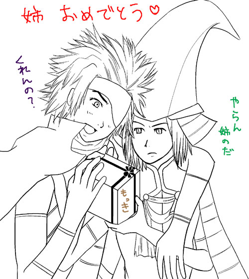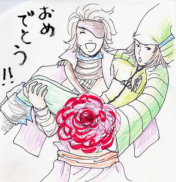 × [PR]上記の広告は3ヶ月以上新規記事投稿のないブログに表示されています。新しい記事を書く事で広告が消えます。 ゆかりです。 姉上、お誕生日おめでとう! うっかり姉と出会ってしまってからというものの、数年前の自分からは取り返しのつかない方向に転がって来ましたが・・・(お互いにな・・・) 楽しいからいいとおもう ということで、これからもどんどん腐っていきましょう。 甲冑子が絵を描いたので私も描いてみました。 しかし、緑川(そして森川)の雑念のせいで色が塗れませんでした。死 それどころか、本当の予定は・・・今日、「姉禁」(姉以外閲覧禁止)のアニキオクラ新刊を出す勢いだったのに、落としてしまった・・・っ!!!不甲斐なさすぎる。 それもこれも、森川が。(?) ↓の甲冑子の絵は、アニキがオクラをくれるのかと一瞬思ったのは私だけですか? そういや、近日姉による連載「ア日記」(あにっき)が始まるみたいですので、お楽しみに! どんな内容なのか想像もつきません。 PR こんばんは。『真田太平記』での幸村をBASARAバージョンで描いてみた甲冑子です。 童○とバレて照れてるところ。 さて。私の漫画はついに残すところ1ページとなりましたが、 ごぼうの後日談を描いていたら1ページはみ出しました。 うーん、得した気分。まだ終わってないんですけどね。 んで、その後日談には軽いイチャイチャシーンがあるのですよ。 どのふたりかって、それはもちろんおにぎり屋公式カップル、こじゅと伊達です。 でさー、イチャコラしてる絵を描くのは別にイイんだけどさ、 (うまく描けてるかどうかは別として。やっぱ難しいねぇ) なんかセリフが昼ドラみたいで「ブッwww」って感じなんですけど。 オチがオチなので真剣にイチャコラした方がイイのですが、 真面目な顔の小十郎にイヤらしいセリフを当てるだけでもう。 最高におかしいのはこじゅだから? さすがだな~。